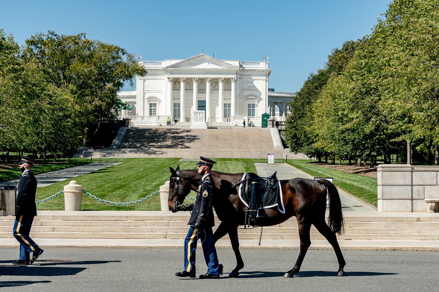 The caparisoned horse is walked in front of the Tomb of the Unknown Soldier at Arlington National Cemetery in Arlington, Virginia. The Third Infantry Regiment United States Army, more commonly known as the Old Guard, is always responsible for the caisson. Caisson is a horse drawn wagon or cart. The two caissons used at the Cemetery are from the WWI time period circa 1918-1919. Originally the caisson was used to bring artillery onto the battlefield. Once the artillery was off-loaded, the caisson was loaded with bodies of fallen service members. The wagon is pulled by six horses, but there are only three riders. The Old Guard service members only ride the horses on the left side because the horses on right side were originally used to take supplies onto the battlefield. Officers with a rank of colonel or above in the Army and the Marine Corps may have a caparisoned (riderless) horse, if available. The riderless horse follows behind the caisson and is guided by an Old Guard service member. The horse wears an empty saddle with the boots in the stirrups backwards to signify the last ride of the officer.